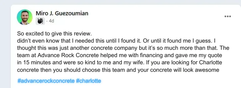 I agree to receive Automated Reminders and Service Based messages from Advance Rock Concrete CLT, at the phone number provided above. This agreement isn't a condition of any purchase. Msg & data rates may apply, message frequencies vary. Text HELP to (704) 261-6090 for assistance, reply STOP or OUT to opt out or unsubscribe at any time.